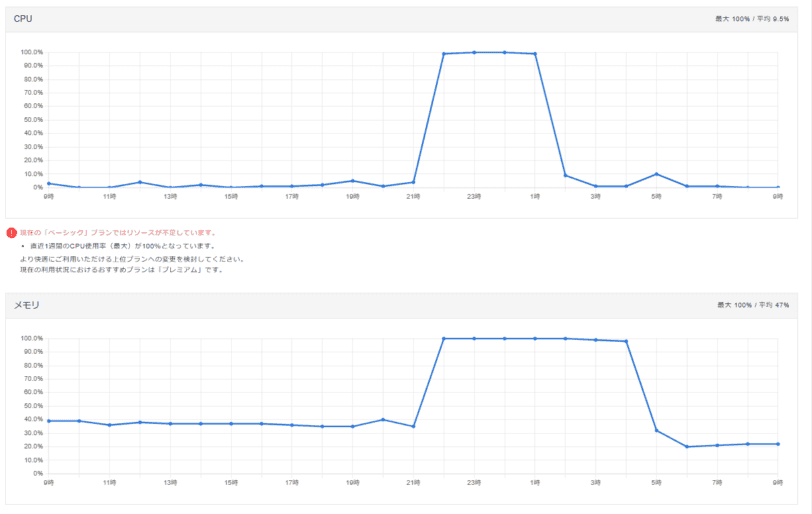 サーバー側が推奨する上位プラン(プレミアムなど)への変更を検討する。とくに複数サイトを運用している場合、ベーシックプランでは日常的にギリギリの可能性があります。