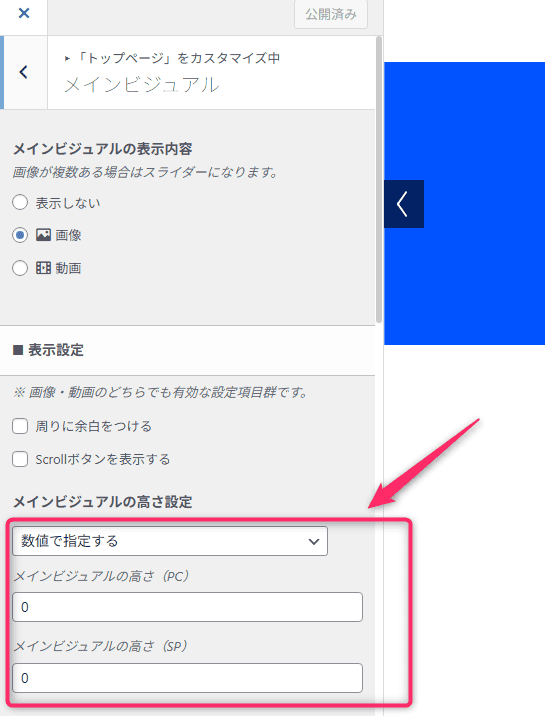 まずはカスタマイズからメインビジュアルの画像を指定。