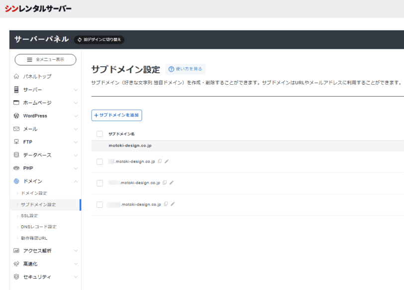今回はhogehoge.motoki-design.co.jp というサブドメインをシンレンタルサーバーに追加したところ、以下の症状が発生しました。